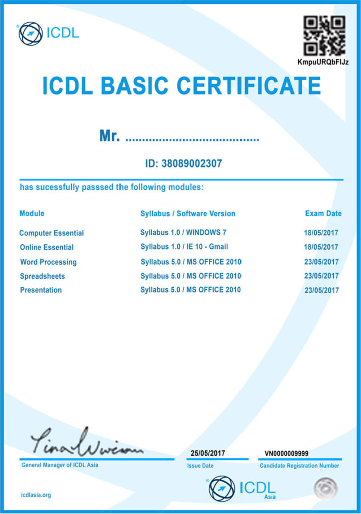 – Chứng chỉ ICDL có thể dùng trong khi đi xin việc các cơ quan tư nhân và nhà nước. Và đặc biệt chứng chỉ này có giá trị vĩnh viễn.