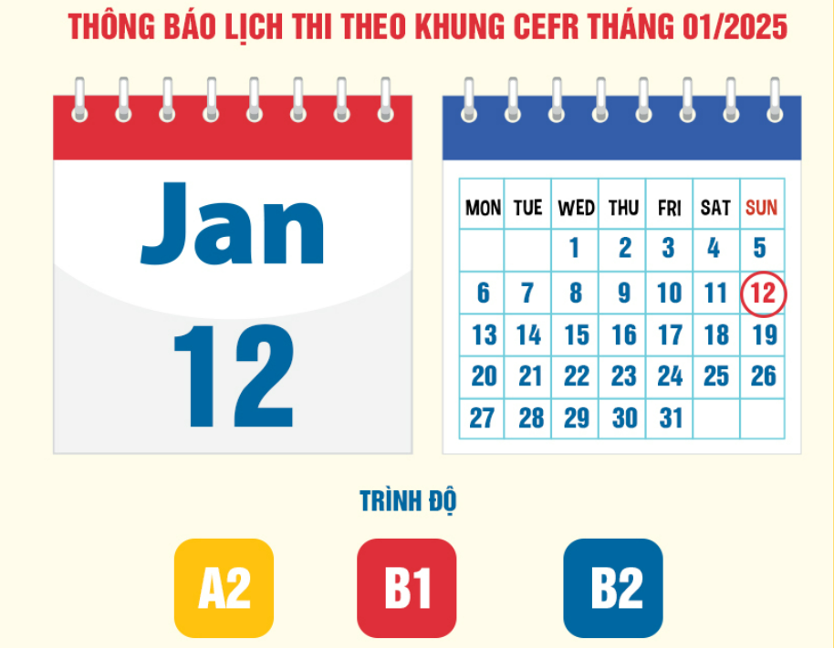 Lịch bồi dưỡng, thi đánh giá năng lực và cấp chứng nhận ngoại ngữ trình độ A2, B1, B2 theo khung CEFR tháng 1/2025